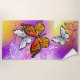 Orange, detailed monarch butterflies on light, purple, picturesque, painted background.