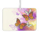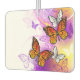 Orange, detailed monarch butterflies on light, purple, picturesque, painted background.