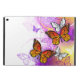 Orange, detailed monarch butterflies on light, purple, picturesque, painted background.