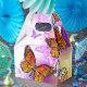 Orange, detailed monarch butterflies on light, purple, picturesque, painted background.