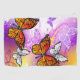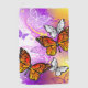 Orange, detailed monarch butterflies on light, purple, picturesque, painted background.