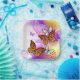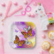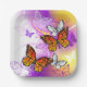 Orange, detailed monarch butterflies on light, purple, picturesque, painted background.