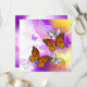 Orange, detailed monarch butterflies on light, purple, picturesque, painted background.