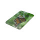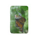 Close-up of Monarch Butterfly fluttering its wings as it visits my pretty white pink flower with green leaves and flower buds from hanging in my basket. The background is a blurred green of shrubs. Original Photography by TamiraZDesigns.