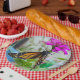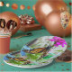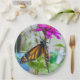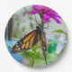 A photograph of a Monarch Butterfly resting on a pink Zinnia flower, printed on paper plates.
