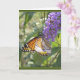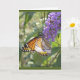 Monarch butterfly hanging from purple flower dual tone border praise card.