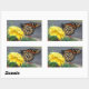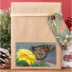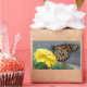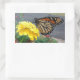 Photo of a monarch butterfly sipping nectar from a yellow zinnia flower.