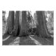 A black and white photo of the base of several large sequoia trees taken in Sequoia National Park, California