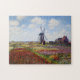 Monet Field of Tulips with Windmill puzzle. Oil painting on canvas from 1886. One of Monet’s most colourful works painted around the Rijnsburg Windmill. The tulip fields are bursting with reds, whites, yellows and greens. A beautiful landscape painting that makes a great gift for fans of Claude Monet, tulips, impressionism, windmills, and French art.