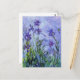 Monet Lilac Irises postcard. Oil painting on canvas from 1917. Monet painted irises throughout his career, this is one of his final iris paintings and certainly one of his most haunting. The work is heavily impressionistic and the dark purple irises almost seem to be floating in water above their dark green foliage, the sky above is soft blue and purple. A beautiful gift for fans of Claude Monet, Impressionism, iris paintings and French art.