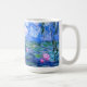 A Monet pink water lilies classic mug, 15oz., featuring beautiful pink water lilies floating in a calm blue pond with lily pads. A great Monet gift for fans of impressionism and French art. Serene nature impressionism with lovely flowers and scenic pond landscape.