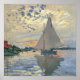 Monet Sailboat - This beautiful French sailboat is by French impressionist Claude Monet, painted in 1874. Monet was one of the most important French impressionist artists that ever lived. The exact title of the painting is "Sailboat at Petit-Gennevilliers," an oil on canvas. The painting shows a single sailboat with a lively sunset in the background and a lovely reflection of the boat in the foreground.