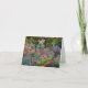 A Monet flower invitation card featuring beautiful pink and purple irises in a garden shimmering underneath tall trees. A great Monet gift for fans of impressionism and French art. Peaceful nature impressionism with lovely flowers and scenic landscape.