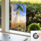 Window Cling featuring Claude Monet’s wife, Camille, holding a green parasol while her blue veil is being blown by the wind in a green and golden field. A great Monet gift for fans of impressionism and French art.