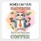 A funny, sarcastic, and colorful design showcases a cat with green eyes and white and gray fur, holding a cup of coffee in each hand. The cat is dressed in a suit jacket with an orange and white striped tie, surrounded by floating dollar bills. The vibrant text reads: "Money can't buy happiness but it can buy you coffee." This design is available on a variety of products, making it a perfect gift for cat lovers.