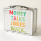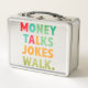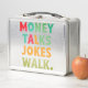 A vibrant, cartoon-style image depicting money as a talking character, likely wearing a suit and tie, with a speech bubble containing the phrase "Money Talks." A second character, representing jokes, is shown walking away, perhaps with a humourous expression. The background could be a colourful gradient or a simple, solid colour. The overall design should be playful and eye-catching, reflecting the humourous nature of the phrase.