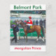 Mongolian Prince and jockey Johnny Velasquez in the winner's circle at beautiful Belmont Park. This gorgeous bay filly just broke her maiden race in the U.S after several wins over seas. Her handlers are trying to attach a halter to her face before the winning photo is taken. The background shows the Belmont grandstand as Velasquez is wearing a bright red and white silks.