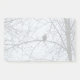 A photograph of a Bald Eagle perched on a tree branch surveying the area. The image was created in winter. The leaves have left the trees and the branches are gathering lumps of snow. A few specks of snowflakes fall over the back of the eagle's feathers. The sky is cloud cover.