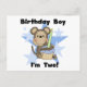 Boy 2nd birthday T-shirts, bodysuits, cards, stickers, magnets, bags, and more featuring a cute boy monkey with a blue frosted cupcake and text that reads "Birthday Boy I'm Two!".