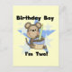 Boy 2nd birthday T-shirts, bodysuits, cards, stickers, magnets, bags, and more featuring a cute boy monkey with a blue frosted cupcake and text that reads "Birthday Boy I'm Two!".