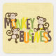 Bright and colourful typography features whimsical monkeys with "monkey business" text in green, brown, orange and yellow. Background is pale yellow linen / burlap look texture.
