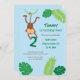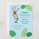 This cute and colourful birthday invitation is ideal to celebrate your son’s 2nd birthday. It features a monkey character hanging from a brach and holding the birthday number. Leaves decorate the border. This playful design is perfect for an active child that likes to have fun.