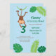 This cute and colourful birthday invitation is ideal to celebrate your son’s 3rd birthday. It features a monkey character hanging from a brach and holding the birthday number. Leaves decorate the border. This playful design is perfect for an active child that likes to have fun.