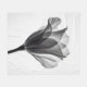 A close-up, monochrome photograph showcases a tulip flower against a bright white background. The flower's petals are delicately rendered, with visible veins adding texture. The image captures the flower from a low angle, emphasizing its upward reach. The stem is slender and dark, contrasting with the lighter petals. The overall mood is serene and elegant, highlighting the flower's natural beauty.
