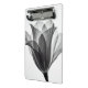 A close-up, monochrome photograph showcases a tulip flower against a bright white background. The flower's petals are delicately rendered, with visible veins adding texture. The image captures the flower from a low angle, emphasizing its upward reach. The stem is slender and dark, contrasting with the lighter petals. The overall mood is serene and elegant, highlighting the flower's natural beauty.