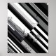 The design is composed of bold diagonal lines in black, white, and various shades of grey. The stripes vary in thickness, creating rhythm and visual depth. Scattered paint splatters and textured overlays enhance the raw, edgy character of the artwork. The interplay of geometric order with spontaneous splashes gives the composition a modern, urban, and industrial aesthetic. The overall style feels dynamic and powerful, perfectly balancing structure with expressive artistic elements.