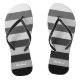 A pair of flip flops with a cool monochrome shades of grey colour block stripes pattern design and a customisable white name print.