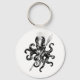 a decorative black and white design of an octopus, kraken or squid holding a trident in its tentacles on a keychain.