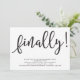 A minimalist typographic invitation for the long awaited engagement. This design features the word "finally!" in bold black hand lettered font and party details in modern sans serif font, all on a white background. The reverse side is in solid black.