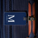 Travel in style with this monogram luggage tag featuring a serif monogram and your name in a calligraphy script on the front. Background color on the front and back is editable, click customize to change the color