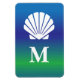 Monogram cruise magnet cabin door decoration with a sea shell on blue green ombre blend background. Edit the custom text initial letter to mark your stateroom door and recognise it easily with your personalised sign. Simple and elegant but fun design.