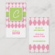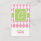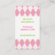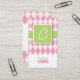 Graphic business card with pink argyle pattern and a linen finish paper. Customise with a monogram on the front.