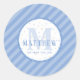 Personalised monogram baby boy round sticker. Custom initial, name and date surrounded by the stars and diagonal stripes. Perfect baby shower or the first birthday favour or gift packaging idea. Traditional pastel baby blue, white and soft khaki colour combo. Add the name and monogram with easy to use Zazzle editing tool! Visit the shop to see all the collection. There are banners, buntings, favour boxes, water bottles, bodysuits and so much more available. And of course, sanitisers and masks are also in the shop!