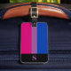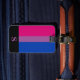 Luggage tag with the bisexual pride flag, pink monogram initial(s)/name on a black stripe monogram frame, name, and address information on a black background. Personalise with your monogram initial(s)/name, name, and address information using the easy templates. Font colour, font style, font size, and background colour are customisable. The perfect colours for travel.