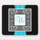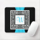 This monogrammed aqua blue, black, and white damask pattern mousepad with a PRINTED ribbon can be customised with your own name, monogram, or other text.