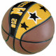 This is a full size basketball with two panels designed with a monogram name (large first letter) and uniform number, in popular college colours. This one is shown in Black, Gold, and White. The second panel has team colours with three stars. All text, art, and colours can be removed, or changed as desired. One panel can be left white for autographs, etc.