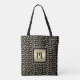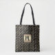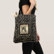 A faux gold foil square with a black script monogram initial overlaying a luxury gold oblong dots pattern on black, highlights this chic, girly, modern monogramed tote bag. Makes a fun and stylish statement every time you run errands with it. A great gift for a friend, as well as yourself!