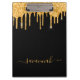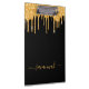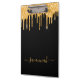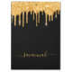 Girly and glamourous. A chic black background with faux gold glitter drips, paint dripping look. Personalise and add a name. The name is written with a modern and trendy hand lettered style script with swashes. Golden coloured letters.