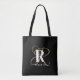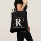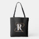 This modern stylish custom monogram tote bag features an elegant gold script initial monogram with a bold white initial and name superimposed, on a black background.