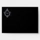 An elegant envelope with a monogram initial in a vintage crest on all sides. It is black outside and faux silver foil inside. The vintage crest is also faux silver foil. The return address is printed on the flap, with the monogram in crest on its left.