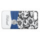 Monogrammed modern black and white floral damask pattern Case-Mate iPhone 7 Case with royal blue PRINTED ribbon and PRINTED faux engraved look crystal brooch. Customise it to add your name, initial, or other text. If you need assistance, email niteowlstudio@gmail.com.
