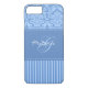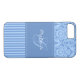 Stylish monogrammed modern tone on tone denim and powder blue damask pattern with stripes iPhone 7 case can be customised with your logo, name, initial, or other text. If you need assistance, email niteowlstudio@gmail.com.
