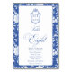 Delft blue floral table number card, designed in a refined blend of chinoiserie and French toile de Jouy style. The soft botanical illustrations frame an arched layout featuring an elegant wedding crest monogram, perfect for couples who love vintage, historic, and European-inspired aesthetics. Classic script typography pairs beautifully with the ceramic-blue palette, making this design an effortless nod to the tradition of “something blue.” Fully customizable with your guest's names, wedding crest and in this design table number: Eight, it’s an exquisite choice for any romantic or sophisticated wedding theme.