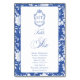 Delft blue floral table number card, designed in a refined blend of chinoiserie and French toile de Jouy style. The soft botanical illustrations frame an arched layout featuring an elegant wedding crest monogram, perfect for couples who love vintage, historic, and European-inspired aesthetics. Classic script typography pairs beautifully with the ceramic-blue palette, making this design an effortless nod to the tradition of “something blue.” Fully customisable with your names, wedding crest and in this design table number: Six, it’s an exquisite choice for any romantic or sophisticated wedding theme.
