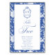 Delft blue floral table number card, designed in a refined blend of chinoiserie and French toile de Jouy style. The soft botanical illustrations frame an arched layout featuring an elegant wedding crest monogram, perfect for couples who love vintage, historic, and European-inspired aesthetics. Classic script typography pairs beautifully with the ceramic-blue palette, making this design an effortless nod to the tradition of “something blue.” Fully customisable with your guests names, wedding crest and in this design table number: Two, it’s an exquisite choice for any romantic or sophisticated wedding theme.
