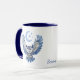 This unique and mystical mug design features a blue owl with outstretched, pattern image wings. His penetrating eyes look straight ahead and claws are outstretched. In the distance, behind and above him, is a crescent mood and silvery blue stars. The image is printed on two sides of the mug, and your name, monogram, or other text is between them. Everything stands out on a crisp white background.